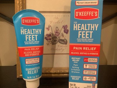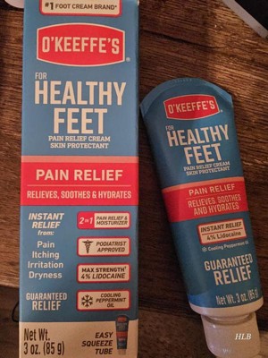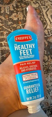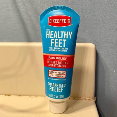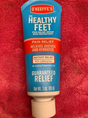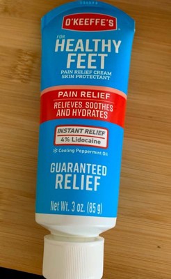 O'Keeffe's for Healthy Feet Pain Relief Skin Protectant Cream rapidly absorbs into skin to provide instant relief from pain, itching, irritation and dryness. This podiatrist approved product relieves, soothes, hydrates and protects dry feet. Healthy Feet Pain Relief has a 2 in 1 benefit by providing instant pain relief and long lasting hydration and moisturization. This is a non-greasy medicated product with 4% lidocaine and cooling peppermint oil.