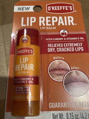 - O’Keeffe’s Lip Repair with Cherry and Vitamin E Oil heals, relieves, and repairs extremely dry, cracked lips.
