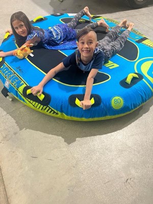 [This review was collected as part of a promotion.] This tube for boats is so cool. It’s the super screamer so it holds three people. If you have a little you can ride with them. Definitely a really fun activity for the summer if you have a boat if not, you can just tie up to the dock and let the kids jump off of it.