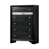 This statuesque black chest adorns itself in five drawers with modest knobs and one silver drawer with a sleek bar pull. This special drawer presents six divided compartments with felt lining to pick jewelry for accessorizing when getting your outfit ready for the day. Plus, the English dovetail construction allows for the largest possible drawer storage capacity in each drawer.