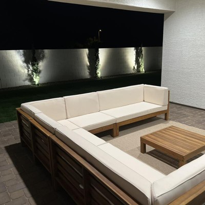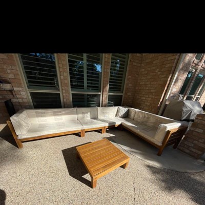 Beautiful sectional!! I love that you can move the pieces individually. The color of the wood is just like the picture, a little darker than teak I would say. It is quite comfortable! Haven’t taken the plastic off the cushions as you can because we built it yesterday. Easy assembly!