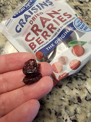Cranberries these are great they're so good they're so fresh and so moist so reasonably priced and you wouldn't believe it but when I bought it I thought it was going to be like an average bag it was three times the average bag that I thought it would be was huge it's going to last me forever and it was reasonably priced I couldn't believe it it should have been twice as much for the bag that it came and it came in a huge bag the size of a cereal bag overall they were great they taste great their moist they're soft it's just a wonderful raisin I love it