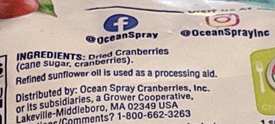 dried cranberries (sugar, cranberries). refined sunflower oil is used as a processing aid.