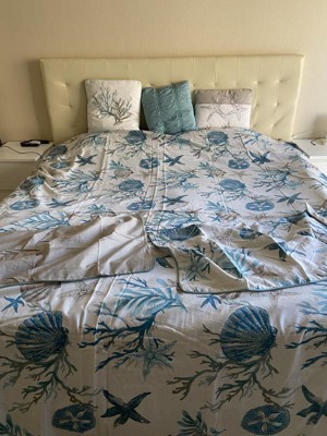 For a coastal update to your space, the Ocean View Printed Cotton Duvet Cover Set is perfect for you! Printed on 210 thread count cotton, the rich coral and teal colors play into the starfish and coral motifs for a textured look adding color to your space. Three decorative pillows use embroidery and fabric manipulation adding dimension to your top of bed. Machine washable for easy care, this cotton sateen duvet cover set brings an extravagant and stylish touch to your bedroom. A button closure helps secure a comforter insert within the duvet cover and four inside ties in the corners help prevent it from shifting (insert is NOT included).