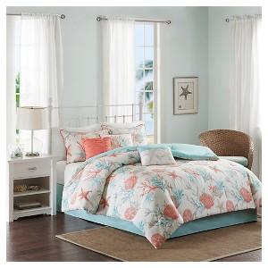 For a coastal update to your space, the Ocean View Printed Cotton Comforter Set is perfect for you! Printed on 210 thread count cotton, the rich coral and teal colors play into the starfish and coral motifs for a textured look adding color to your space. Three decorative pillows use embroidery and fabric manipulation adding dimension to your top of bed. Machine washable for easy care, soft to the touch with hypoallergenic filling, this comforter set adds a touch of charm to your bedroom.