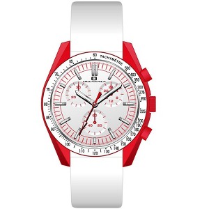 Plastic case, Leather strap, White dial, Chronograph Quartz movement, Scratch resistant mineral, Water resistant up to 5 ATM - 50 meters - 165 feet