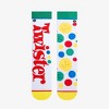 Twister Split Big Kids Crew Socks. Introducing the Twister Split Crew Socks, designed for big kids aged 7-10. These socks are inspired by the classic game and feature the iconic colorful dots and bold Twister logo, adding a playful twist to any outfit. The vibrant mix of red, blue, green, and yellow spots captures the essence of the game, making every step feel like a move on the mat.