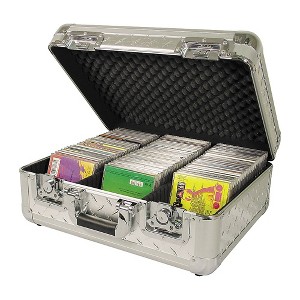 Aluminum diamond plate case with ultra-tough corners, padded lining, a serious handle, rugged hinges and latches, and general design excellence make this the perfect armor for jewels. Holds 300 CDs in soft sleeves/100 in jewel boxes and looks fabulous doing it.