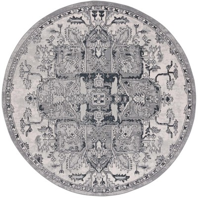 Elevate your home with the timeless elegance of our 6'-7" X 6'-7" Round area rug, boasting a serene grey and ivory color palette that exudes sophistication. This traditionally-styled masterpiece is power-loomed to perfection in Turkey, employing meticulous technique and the finest polyester fibers to create a piece that's not only beautiful but also durable.