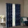 Combining luxe style with functionality, our SunSmart Bentley Ogee Knitted Jacquard Total Blackout Panel is the perfect update to dress any window. An ogee knitted jacquard design is featured in a rich navy hue, creating a luxurious sheen and texture. The heavy fabric uses a foamback and bonding finish enhancing the panel to block out all sunlight, provide a maximum protective barrier against noise intrusion, and offer a maximum level of privacy and energy savings. A silver grommet top finish makes it easy to hang, open, and close panels throughout the day; fits up to a 1.25” diameter rod. With 100% total blackout properties, this window panel is the perfect addition for bedrooms, media rooms, or any private spaces, giving your home a lavish and contemporary appeal. Lighting level: Pitch Black Ambiance.