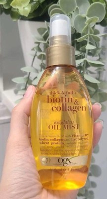 - HELP NOURISH & STRENGTHEN: all types of dry and brittle hair, color treated hair, or hair damaged by brushing, styling and straightening with OGX Thick & Full + Biotin & Collagen Weightless Oil Mist; Strong hair is beautiful