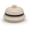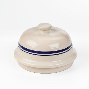 Make Artisan Bread Right at Home! This attractive stoneware bread baker creates the steam that's needed for crunchy, chewy crusts while bread stays moist and soft. Not only will you get a better crust and delicious results, its vintage-like design will look great in your kitchen - in use or on display! Inspired by the stoneware of yesteryear and made in our home state of Ohio. Use in your home oven. Bell shaped, blue striped cover has a wide knob on top for easier handling. Unglazed bottom pan. Microwave and oven safe up to 450 degrees F. Lead and cadmium free. Top cover: 7" x 11-5/8"OD. Bottom pan: 2"H x 10-3/4"OD. Weight: 8 lb. USA made in Ohio. For best care:Oil your pan with neutral-flavored vegetable oil or cooking spray before each use; a nice patina will develop over time. For additional prevention of sticking, sprinkle a thin layer of cornmeal or semolina into the bottom of the oiled pan.. Putting your room temperature pan into a preheated oven is fine.. Protect from extreme temperatures. Never put in freezer; don't transfer from refrigerator to hot oven, or vice versa. Let it cool before washing.. Hand wash with warm water only. Do not use soap as stoneware will absorb it.. Do not use under a broiler or on a stovetop.. No need to soak in water before use (it's neither recommended nor necessary).. Protect your kitchen table and counter from scratches. Set pan on a trivet when it's not in the oven..