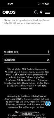 I love the taste of these shakes and I eat Oikos protein greek yogurt everyday so I'm a big fan of Oikos products. The problem is that these shakes contain inulin which is basically chicory root and that really upsets my stomach. I was so happy when the Oikos greek yogurt reformulated a few years so it no longer contained it and I could eat it, but sadly these drinks contain it so I won't be buying them.