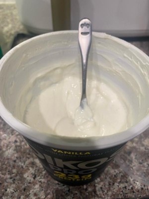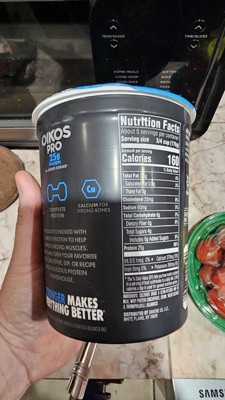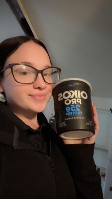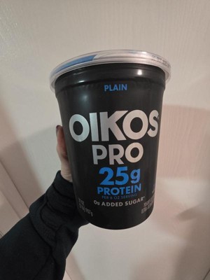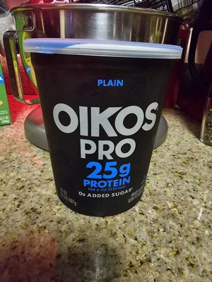 [This review was collected as part of a promotion.] Oikos pro yogurt has 25g of protein per serving. It’s a super thick and creamy yogurt. No added sugar. Very tart and pairs nicely with fruit and granola.