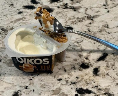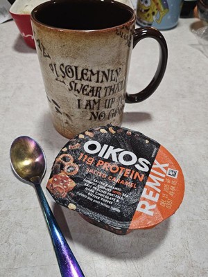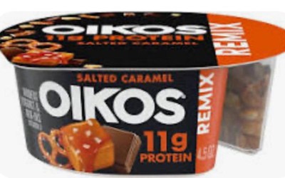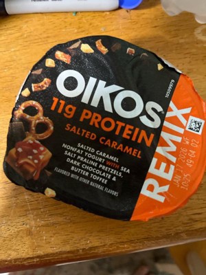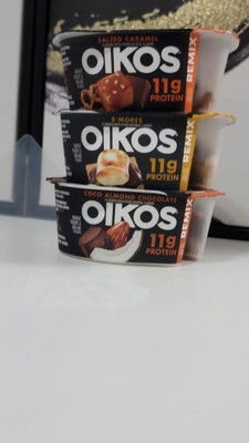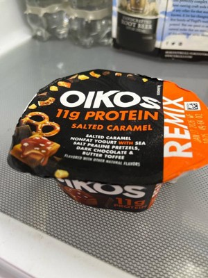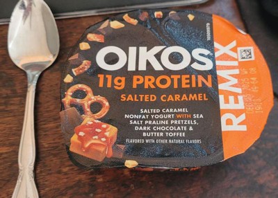 - TAKE YOUR SNACKING ROUTINE TO THE NEXT LEVEL: One 4.5 oz cup of Oikos REMIX Salted Caramel Nonfat Greek Yogurt with complete protein and bold mix-ins