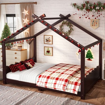 Product Name: Okak Full House-Shaped Floor Platform Beds with Support Slats,Solid Wood Bed Frame for Kids,Teens,No Spring Box Needed,Espresso