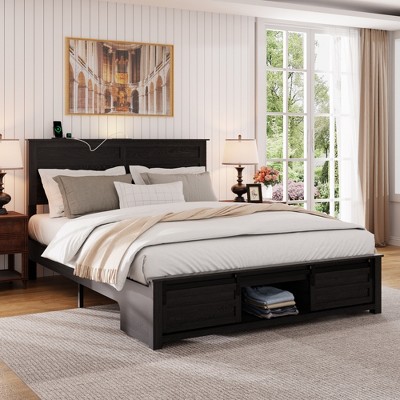Okak Full Size Platform Bed Frame with Storage Cabinet & Charging Station,Farmhouse Wood Slats Design Master Bedroom Bed,White