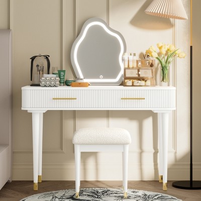 Okak Makeup Vanity Table with Large Mirror and Touch Screen, Vanity Desk with Large Drawer and Arched Corner, Dressing Table for Bedroom, White