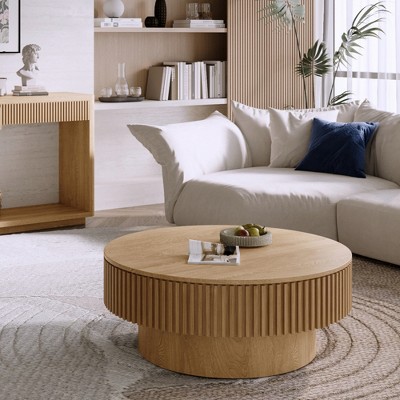Product Name: Okak Mid-Century Modern Cylinder Coffee Table with Textured Barrel Design 32" Dia x 16"H, Retro Accent for Living Room, Wood