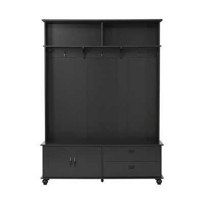 Okak Modern Hall Tree with Storage Cabinet and 2 Large Drawers, Widen Coat Rack with 5 Hooks, Coat Tree for Entryway, Living Room, Black