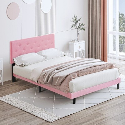 Okak Modern Queen Platform Bed Frame with Upholstered, Linen Button Tufted Headboard Sturdy Wood Slats No Box Spring Needed Easy Assembly, Pink