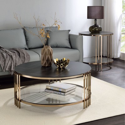 Product Name: Okak Modern Round Side Coffee Table with Sintered Stone Top,Fluted Leather Veneer Center Table for Living Room,Bedroom,Black17.71"