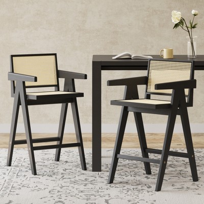 Okak Set of 2 Solid Wood Counter Height Bar Stools for Dining Rooms,Natural Finish Kitchen Island Armchairs with Rattan Back,Black