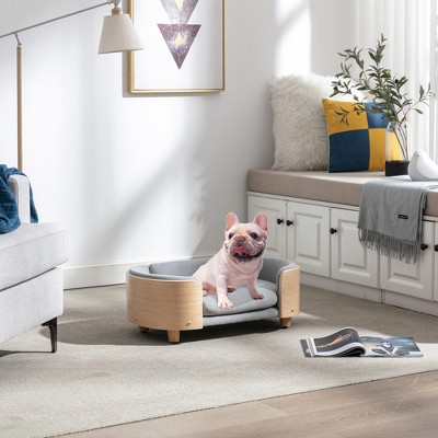 Okak Small Elevated Dog Bed with Solid Wood Legs and Bent Wood Back, Dog Couch with Velvet Cushion, Pet Bed for Small Size Pets, Dark Gray+Oak