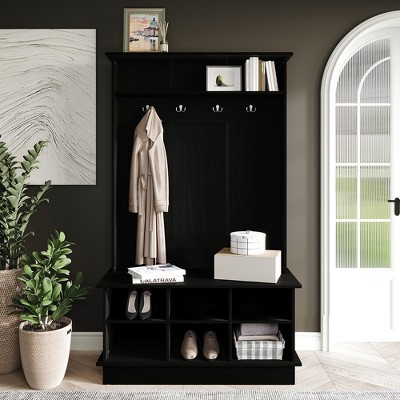 The hall tree features a roomy storage configuration that maximizes organizational potential.