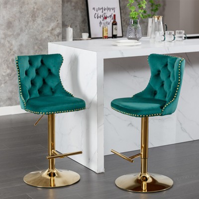 Okak Swivel Velvet Barstools with Adjusatble Seat Height Set of 2, Modern Upholstered Bar Stools with Gold Base for Home Pub, Green