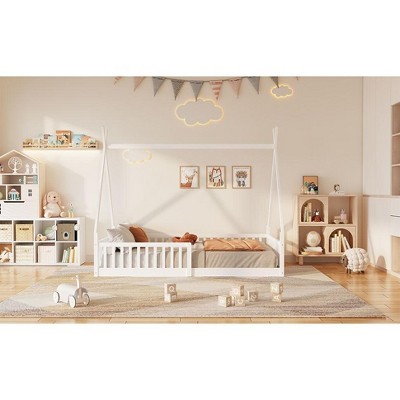 Okak Twin Size Floor Bed Frame, Children's Floor Bed Frame with High Safety Rails & Door, Modern Low Bed Frame for Children's Bedroom, White