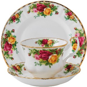 The best-selling dinnerware pattern in the world, the Old Country Roses pattern is practically synonymous with the name Royal Albert and a long-standing testament to timeless style and elegant craftsmanship. This 3-Piece Place Setting includes a teacup, tea saucer & salad plate and is decorated with the Old Country Roses signature motif of burgundy, pink and yellow roses, accented with lustrous gold banding.