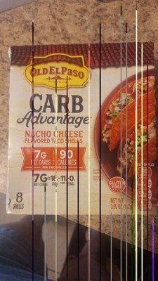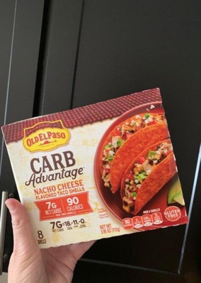 Enjoy Old El Paso Crunchy Taco Shells, the Carb Advantage way. Each two-shell serving of Old El Paso Carb Advantage Nacho Cheese Flavored Taco Shells contains 7g net carbs* and 90 calories. Every bite brings mouthwatering nacho cheese flavor with a satisfying crunch. Stuff them with meats, cheeses, beans, avocado, and more. For max crunch, heat taco shells in the oven at 325 degrees Fahrenheit for four to five minutes. Or microwave on high for 45 seconds. Make these taco shells a part of weeknight dinners with the family. Serve them at get-togethers and celebrations, or add them to your game day taco bar. Our Carb Advantage Taco Shells bring so many tasty ways to enjoy your favorite taco night food and recipes. *7g net carbs = 18g total carbs - 11g fiber - 0g sugar alcohol