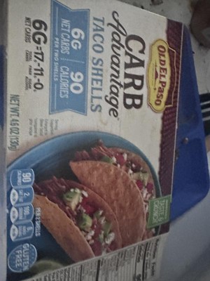 Enjoy the Old El Paso Crunchy Taco Shells you love, the Carb Advantage way. Each two-shell serving of Old El Paso Carb Advantage Crunchy Taco Shells contains 6g net carbs* and 90 calories. The delicious taste comes through in every crunch of these gluten free taco shells. Stuff them with meats, cheeses, beans, avocado, and more. For max crunch, heat taco shells in the oven at 325 degrees F for about 5-6 minutes. Or microwave on high for about 30-45 seconds (do not heat in a toaster oven). Make these taco shells a part of weeknight dinners with the family. Serve them at get-togethers and celebrations. These shells bring so many tasty ways to share food and recipes you love with people you love. Contains shelf-stable, cooked Old El Paso Carb Advantage Crunchy Taco Shells, 6g Net Carbs, 90 Calories, 10 Ct, 4.6 oz. *6g net carbs = 17g total carbs - 11g fiber - 0g sugar alcohol.