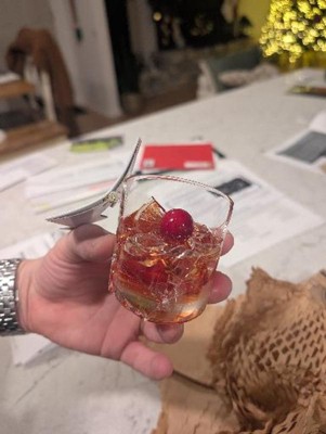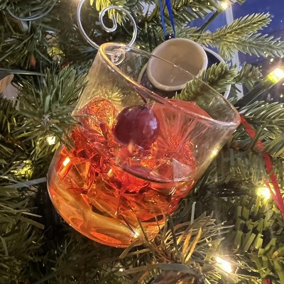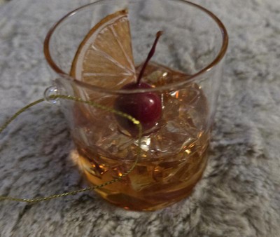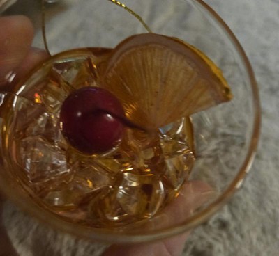 A: The ornament features an old fashioned cocktail in a glass with a cherry and ice.