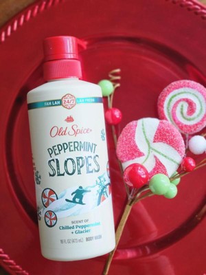 - PEPPERMINT SLOPES BODY WASH: Elevate your shower routine with Old Spice Peppermint Slopes Body Wash, delivering a refreshing cleanse and festive peppermint fragrance.