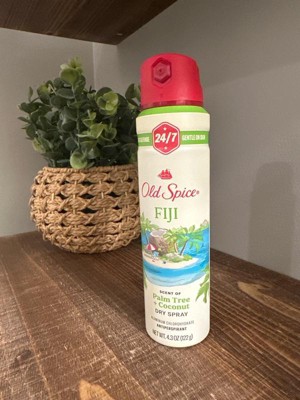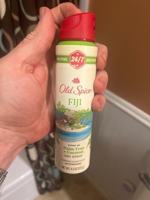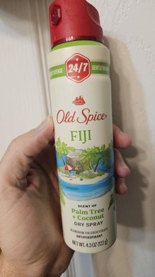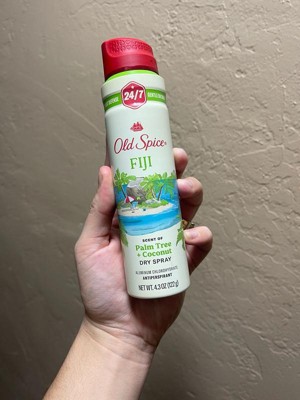 [This review was collected as part of a promotion.] The Old Spice Fiji Antiperspirant Dry Spray is a high-performance grooming product designed to provide 24/7 sweat and odor defense with a single daily application. It features a popular, tropical scent that blends notes of fresh palm trees and coconut to evoke the feeling of an island vacation. The "invisible" formula is specifically engineered to apply completely clear, ensuring no white marks or unsightly stains are left on clothing. Unlike traditional wet sprays, this aerosol dries almost instantly upon contact with the skin, eliminating any sticky or damp sensations. It utilizes patented motion-activated technology to release extra bursts of fragrance throughout the day as you move. The spray is gentle enough for everyday use on normal skin while remaining powerful enough to handle intense activities like gym workouts. For security and portability, the sleek 4.3 oz canister includes a convenient twist-lock cap to prevent accidental discharge in bags. Users frequently praise the product for its lightweight, airy texture that provides a clean feeling without a heavy film. To apply effectively, it is recommended to shake the can well and hold it approximately six inches from the underarm for a two-to-four-second burst. Overall, it offers a reliable, low-maintenance solution for those seeking long-lasting freshness and a vacation-inspired aroma.
