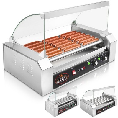 Olde Midway’s electric hot dog machines with bun warming drawers make it easy to prepare mouth-watering rotisserie style hot dogs, conveniently cooking multiple hot dogs at once on its stainless steel rollers. These portable commercial-grade cookers allows you to cook almost anywhere, without the trouble of a full-size gas grill. The high-quality construction of these machines is ideally suited for both commercial and household use. Use these hot dog grill machines for company cookouts, convenience stores, movie theatres, farmer's markets, concession stands, school events, backyard BBQs, birthday parties, sporting events, and more. Featuring dual-temperature controls located on the front panels of the hot dog makers that allows for continuous cooking on the back rollers, while the front rollers keep the cooked items hot and ready to serve. The versatile stainless steel rollers can handle all types of meats and meat substitutes, including standard as well as extra-large, stadium-sized hotdogs, thick and thin sausages, brats, even frozen hot dogs. Olde Midway is well-known within the industry for finely crafted, specialty appliances that combine stylish design with exceptional durability at a great value.