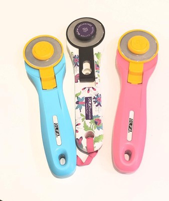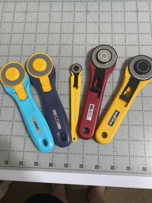 I own only Olga rotary cutters, about a dozen at this point including the quick change in aqua, pink & purple, a few more 45 mm, 2 60 mm & a couple 28 mm! I love them all & it’s the one I recommend to all my students!!
