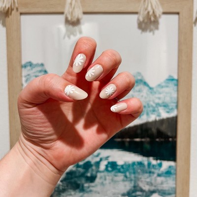 - A neutral mani dotted with fresh daisies in a medium oval shape.