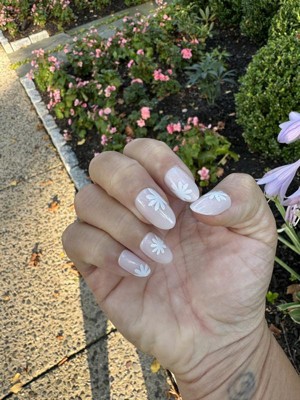 [This review was collected as part of a promotion.] i love tab pressies. they lasted longer than a week with no jiggling, lifting or tip wear! i am loving the neutral (leaning slightly pink) base. and the white flowers are sweet and fun. it’s a great way to have a neutral nail with a little pizzaz. the length is perfect and gorgeous.