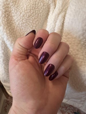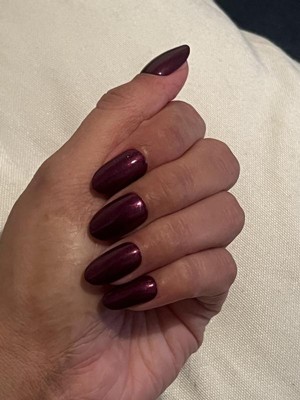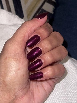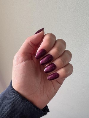One of my favorite colors I've ordered from Olive and June! Purple with a reddish shimmer, looks great on. Would definitely reorder.