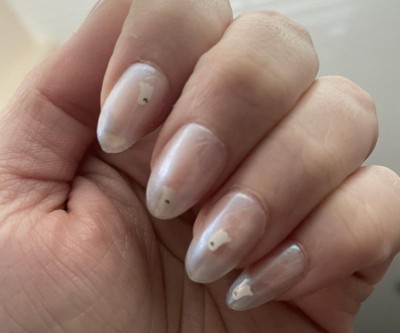 They’re cute, but I saw these in store and didn’t look through the pictures online so I didn’t realize they’re very transparent. The picture online doesn’t look accurate attest because they are transparent with an iridescent look. I don’t know if there is a special trick, but on mine I can see the glue and even the Olive and June logo. If you look closer on my middle finger near the cuticle, you can see it in my picture.