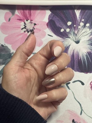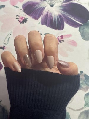 - A mixed greige and shimmery golden bronze mani in a medium almond shape.