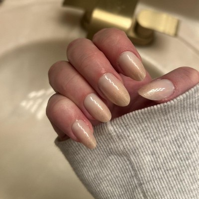 - A soft pink glitter to neutral gradient in a medium oval shape.