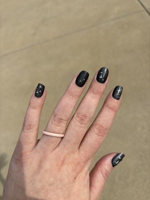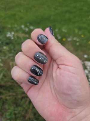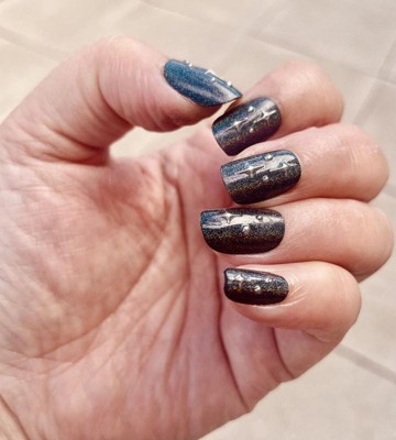 [This review was collected as part of a promotion.] At first, these press ons look like silver 3-D stars on metallic dark gray or black—but when the light catches these, the holographic prism effect is what makes these really special! Imagine the rainbow colors you see in a puddle of motor oil … but on a beautiful chic nail! I loved how easy they were to shape without affecting the puffy star design. You have to see these in person—photos don't capture the full holo effect.