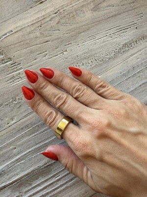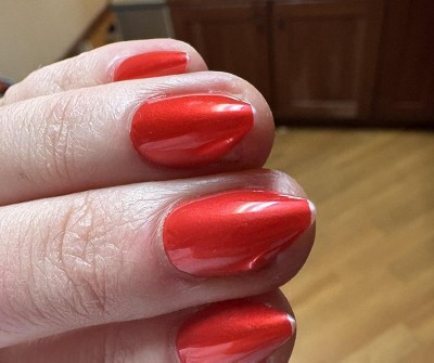 [This review was collected as part of a promotion.] The nail isn’t completely red, more of a red paint over a pearlescent white base, so after a day of wear the red starts to chip around the outer edge. These are also much thinner than other styles I’ve used and torn very easily.