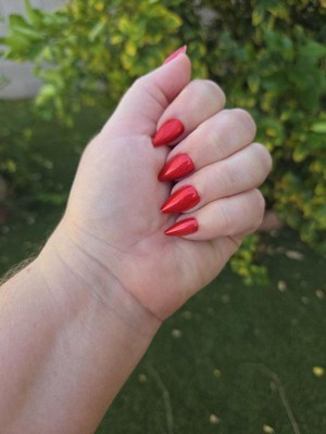 Love the intensity of this color. It is gorgeous for the holidays. The tips did chip off color a little, which is noticeable on stilleto tips. Might try adding top coat to them. They lasted 11 days, easy to put on with glue.