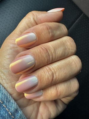 - A shimmery summer sunset pink gradient mani in a short round shape