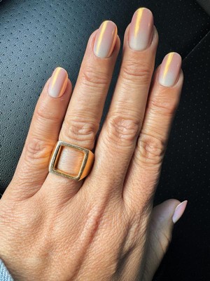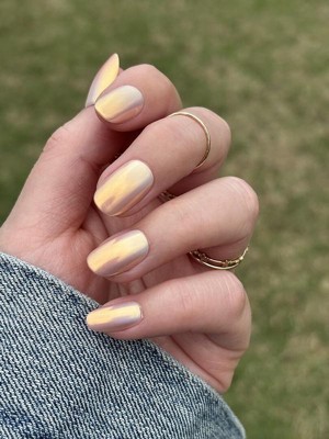 I love this shade! They’re not super bright orange — almost more of a chrome nude, which I don’t think I’ve ever seen before. The nail application process was straightforward and fast. I appreciate how easy it is to reattach the press-ons in the event that they pop off. I’m pretty tough on my hands and I was pleased with how well these stayed on.